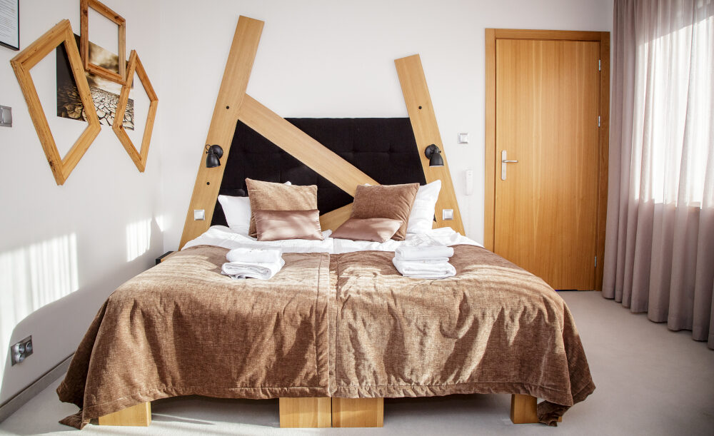 Pokój Brązowy nawiązuje do brązu ziemi. Kolor daje przyziemność, stateczność i przytulność. Do pokoju o wschodzie zagląda słońce.